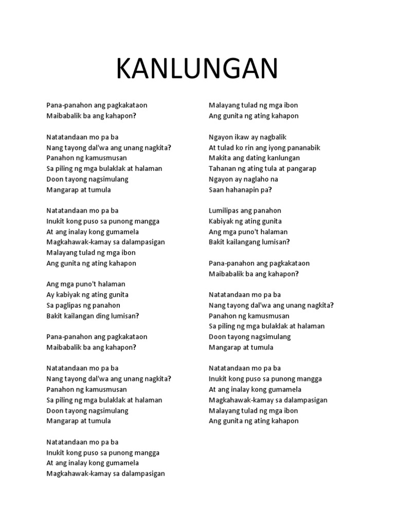 Itoy nabuo matagay na panahon na kayat mahirap alamin kong sinu talaga ang unang may akda nito. Pagdating ng panahon English translation Artist. Sa hapdi ng ala-ala.