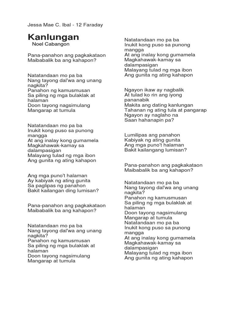 12032019 English translation of lyrics for Kanlungan - Pana-Panahon by Noel Cabangon feat. The heart that I carved on the mango tree. Ang gunita ng ating kahapon Refrain 1.